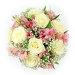Discover the sophistication and charm of our hand-tied bouquet, a perfect blend of white roses, pink alstroemeria, gypsophila, and lush greenery. This unique arrangement exudes elegance, making it an ideal choice for any celebration or special moment.